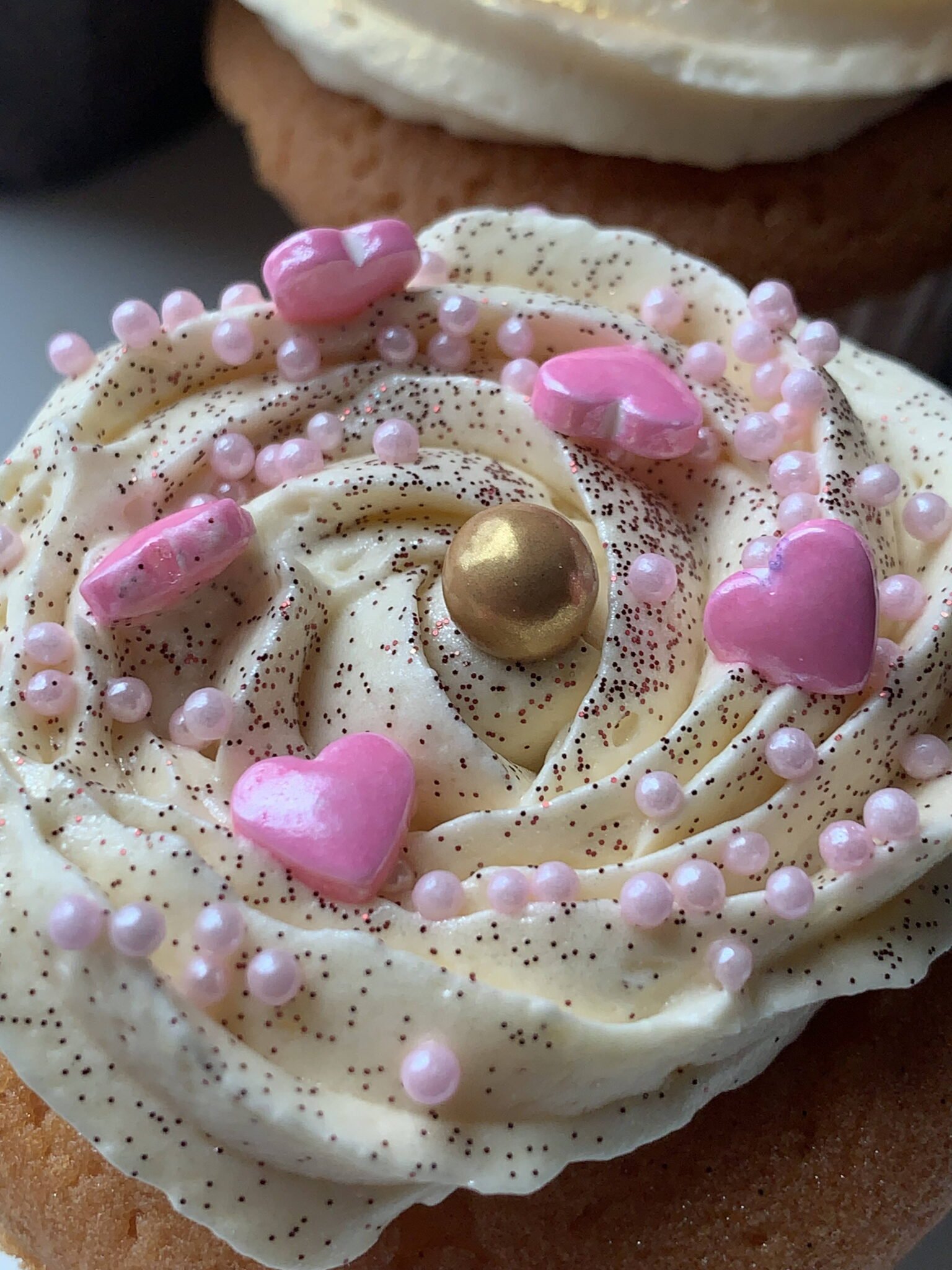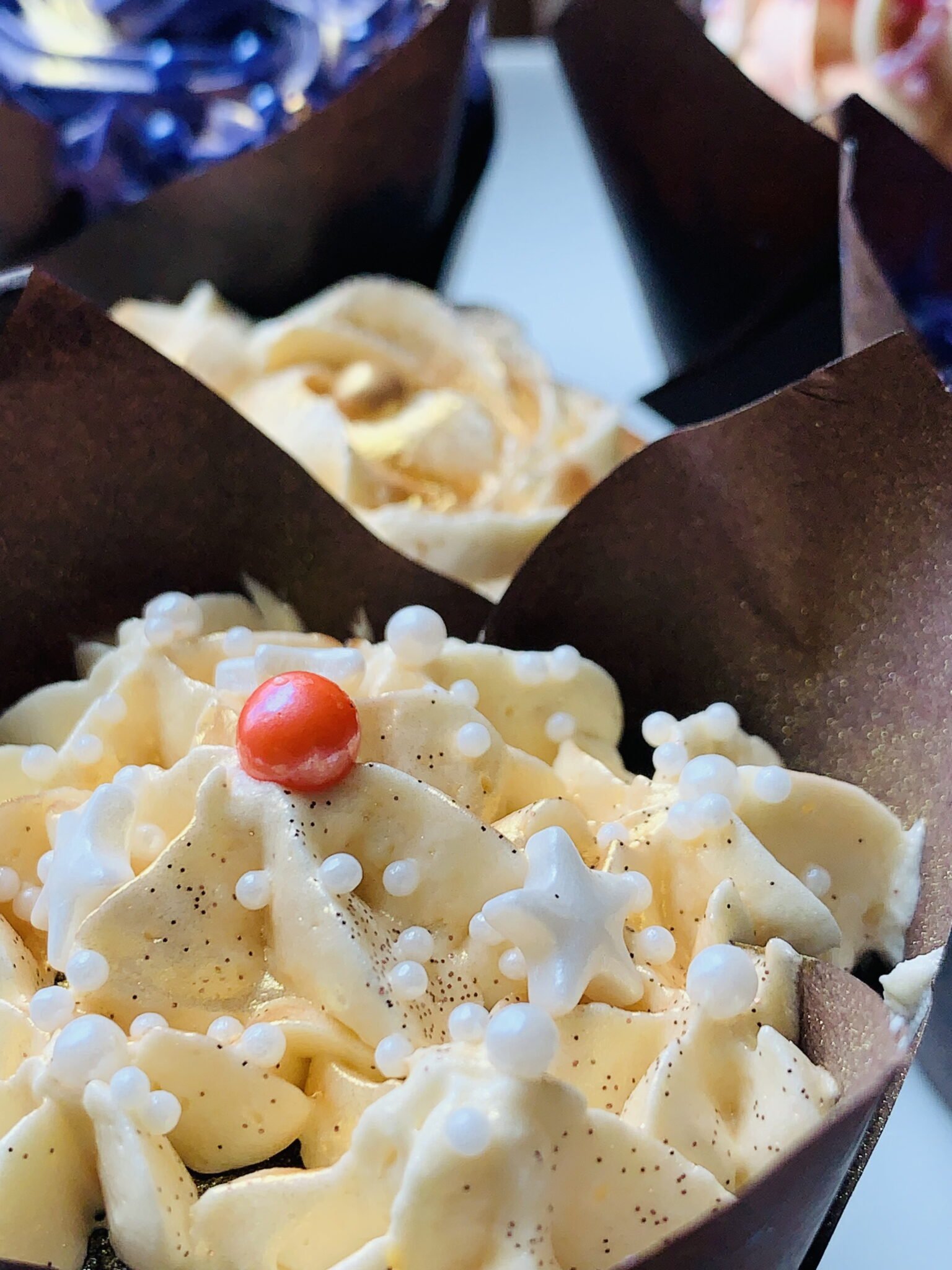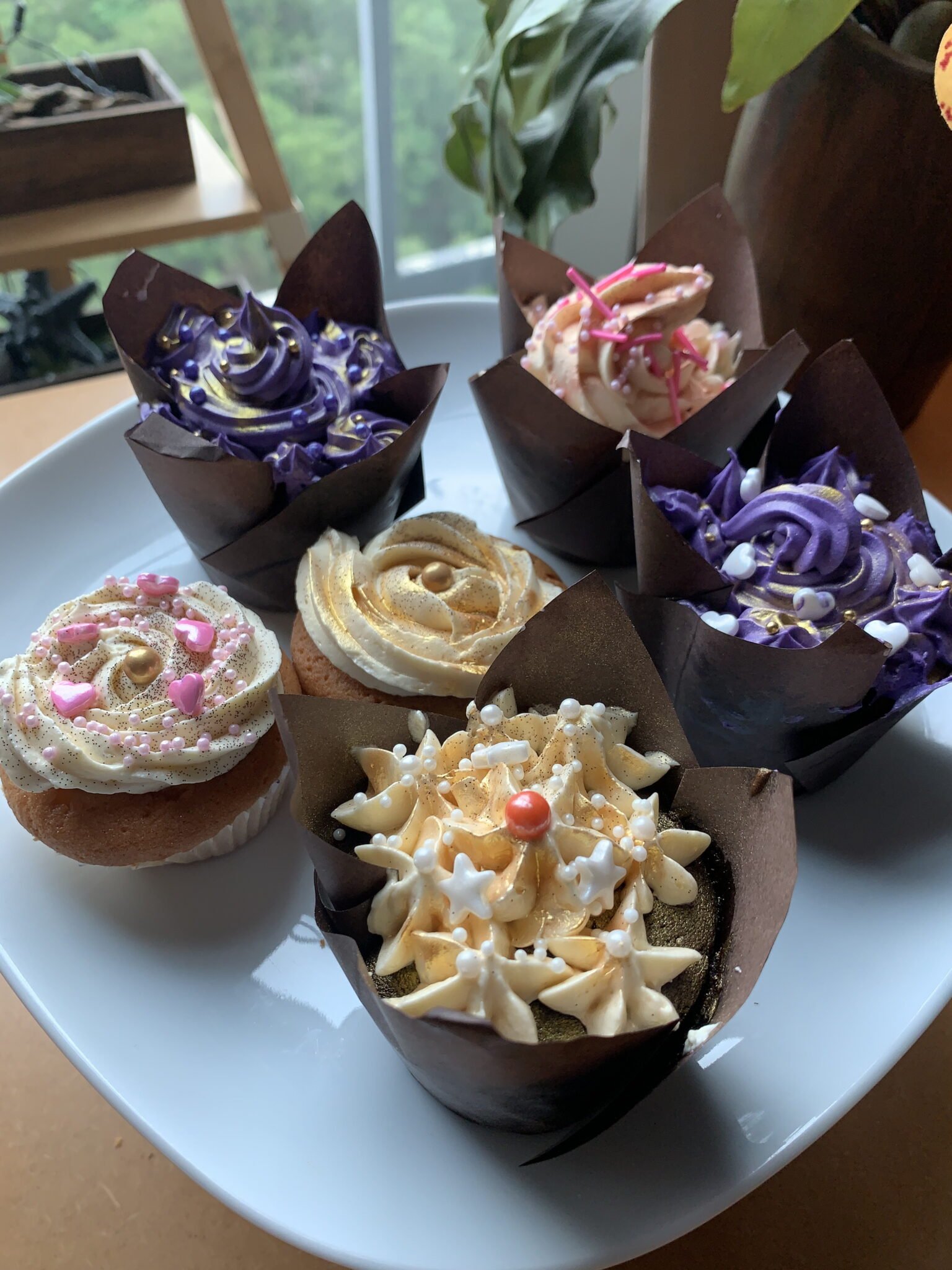 Base cupcake flavors that comes with smooth not too sweet Swiss Meringue Buttercream and colorful decorative elements by request. All cupcakes comes in a box of 1 dozen pieces