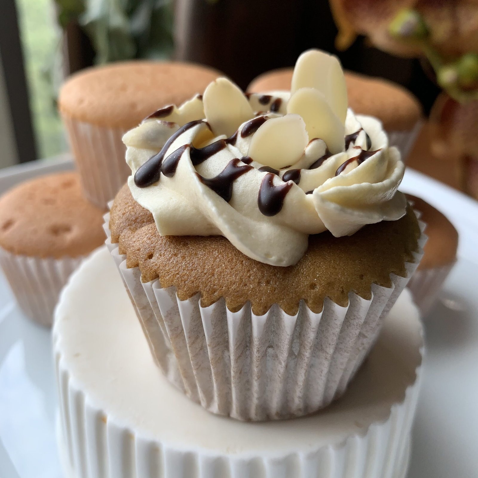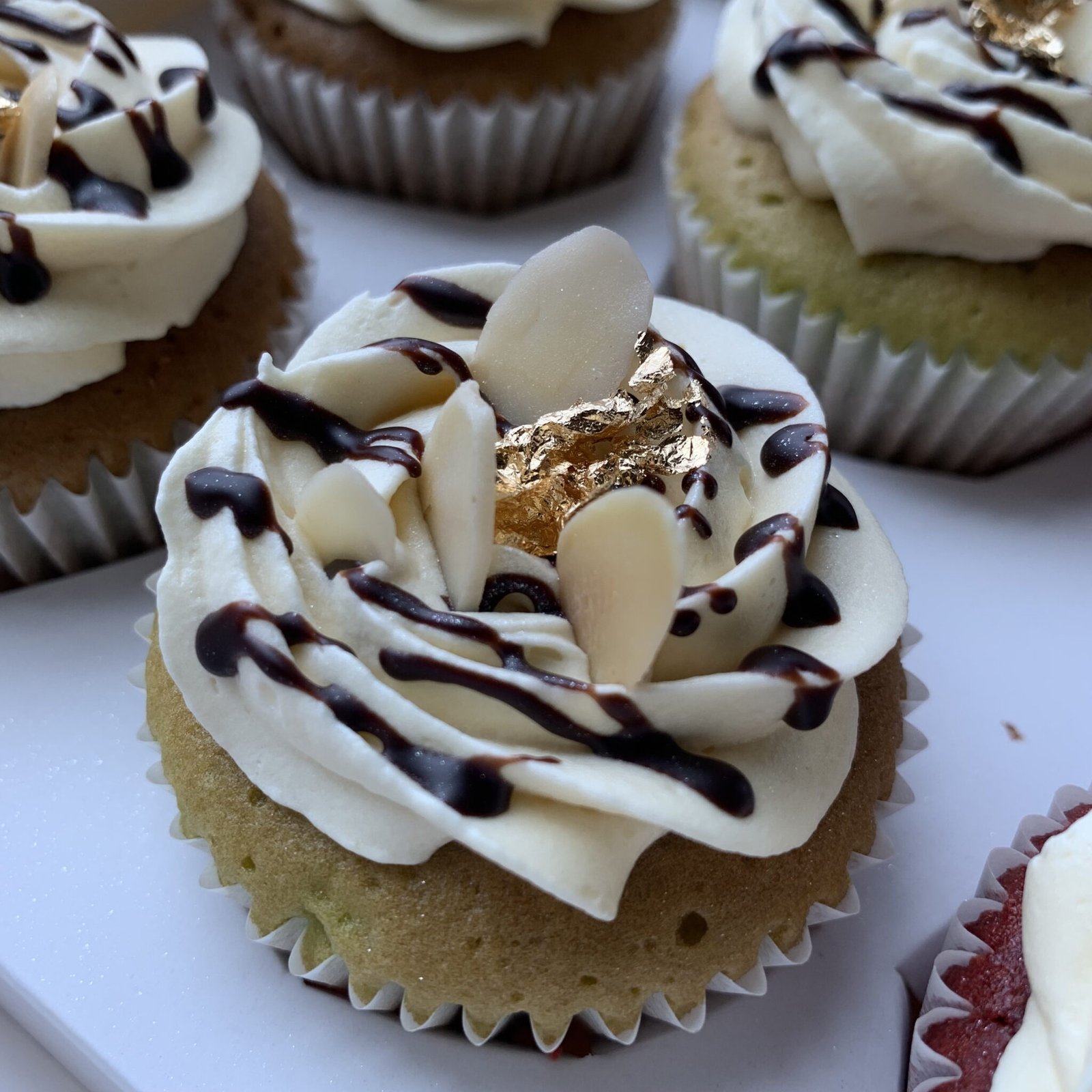 Flavorful pandan based cupcake topped semi sweet Swiss Meringue Buttercream, almond flakes, chocolate & caramel drizzle