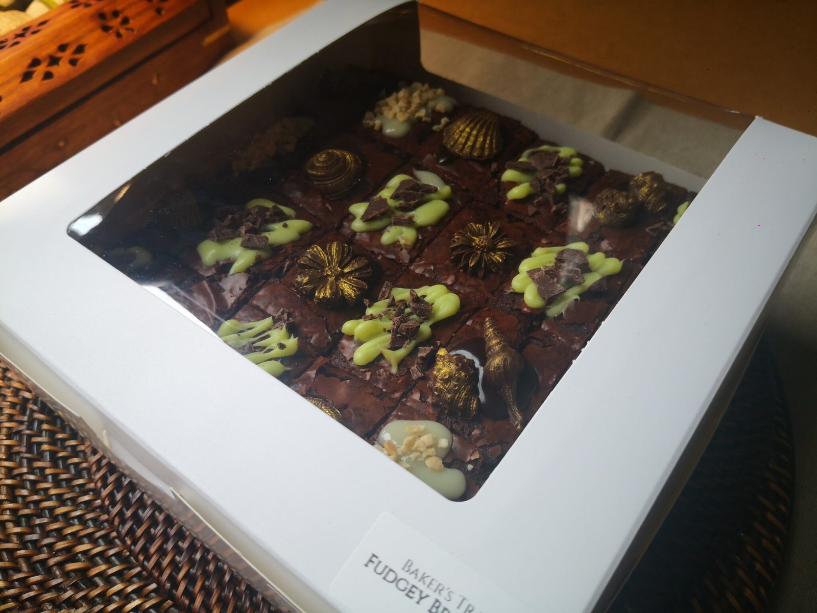 Tags: Almonds, Baker's Tray, Brownies, Chocolate, Chocolate Ganache, Dairy, Dark Chocolate, decorative, Deluxe, Eggs, Flour, Fudgey, No Preservatives, Pre-Cut, Salted Caramel, Square Pan, Tray Bakes Fudgey Brownies Baker’s Tray ” Deluxe “ Full Menu List The Bakery Check out our other bakes Royal Choc Victoria Sandwich Cake Orange Fudgey Dark Chocolate Cake Medallion Butter Cookies Signature Neo Neapolitan Cake Gingernut Snap Cookies Fudgey Brownies Share This Page Share this content Opens in a new window X Opens in a new window Facebook Opens in a new window WhatsApp Opens in a new window Pinterest