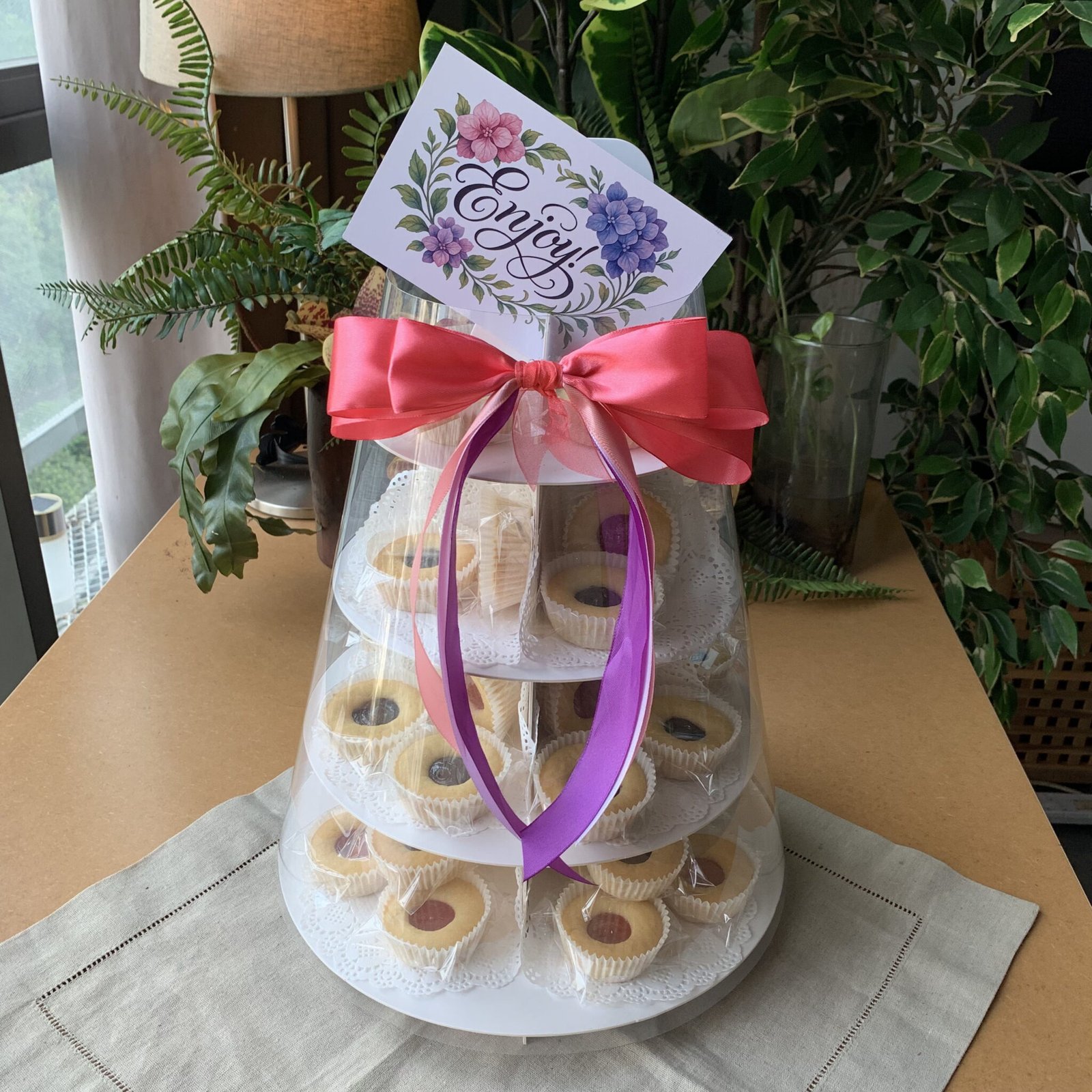 40pcs of cookies stacked on a 4 tier dessert tower. Ribboning and printed card included
