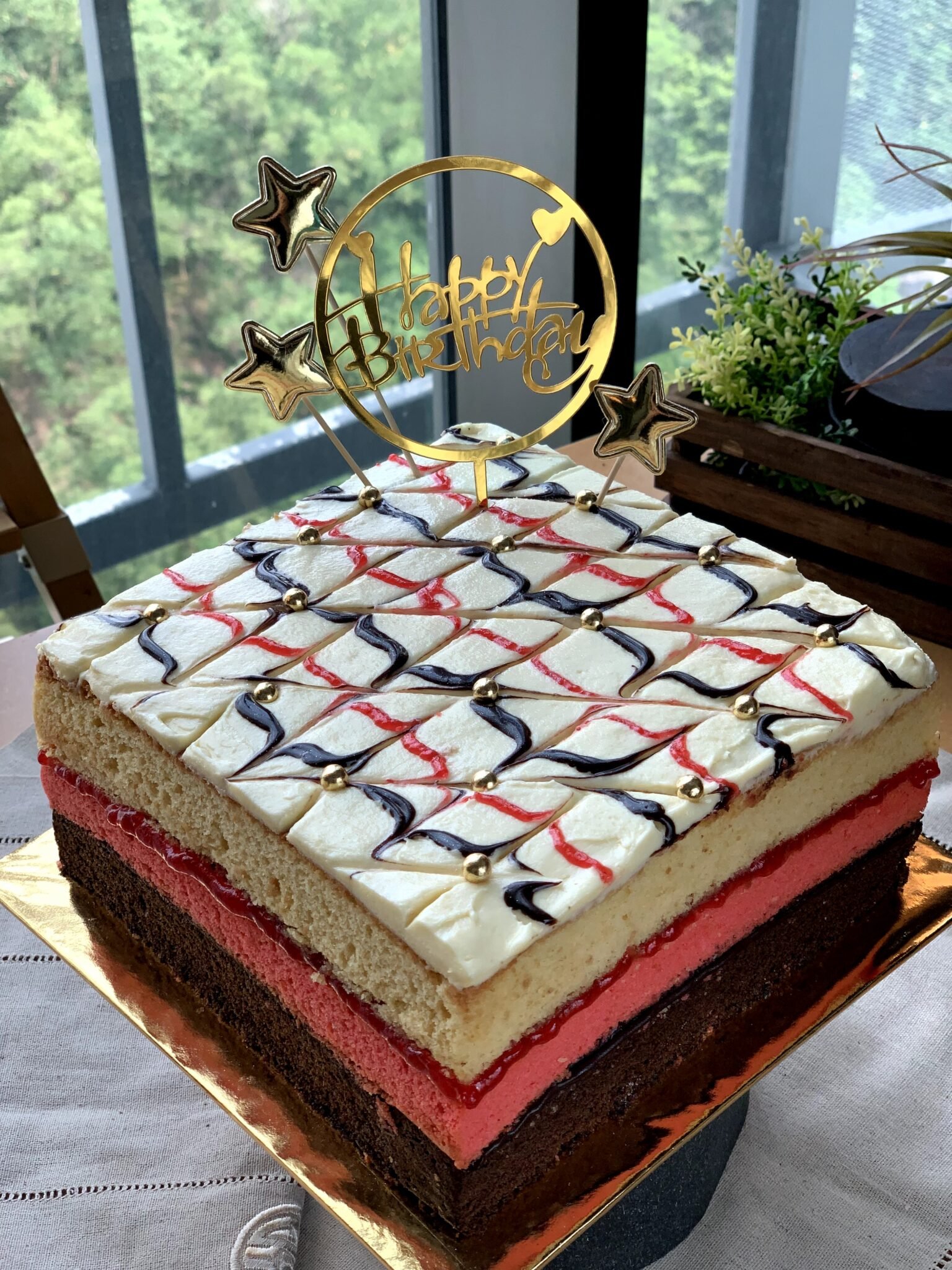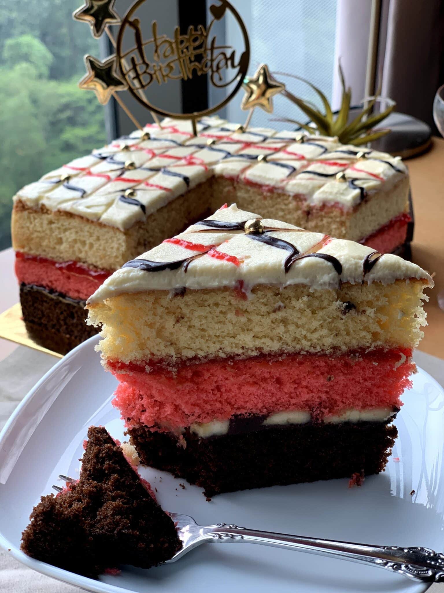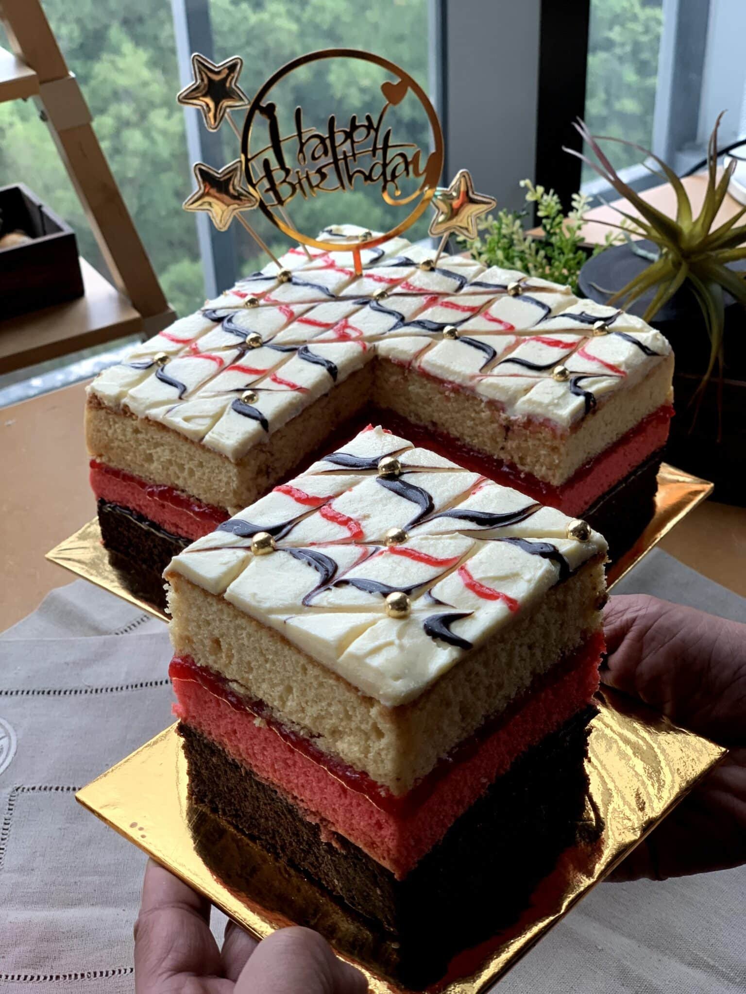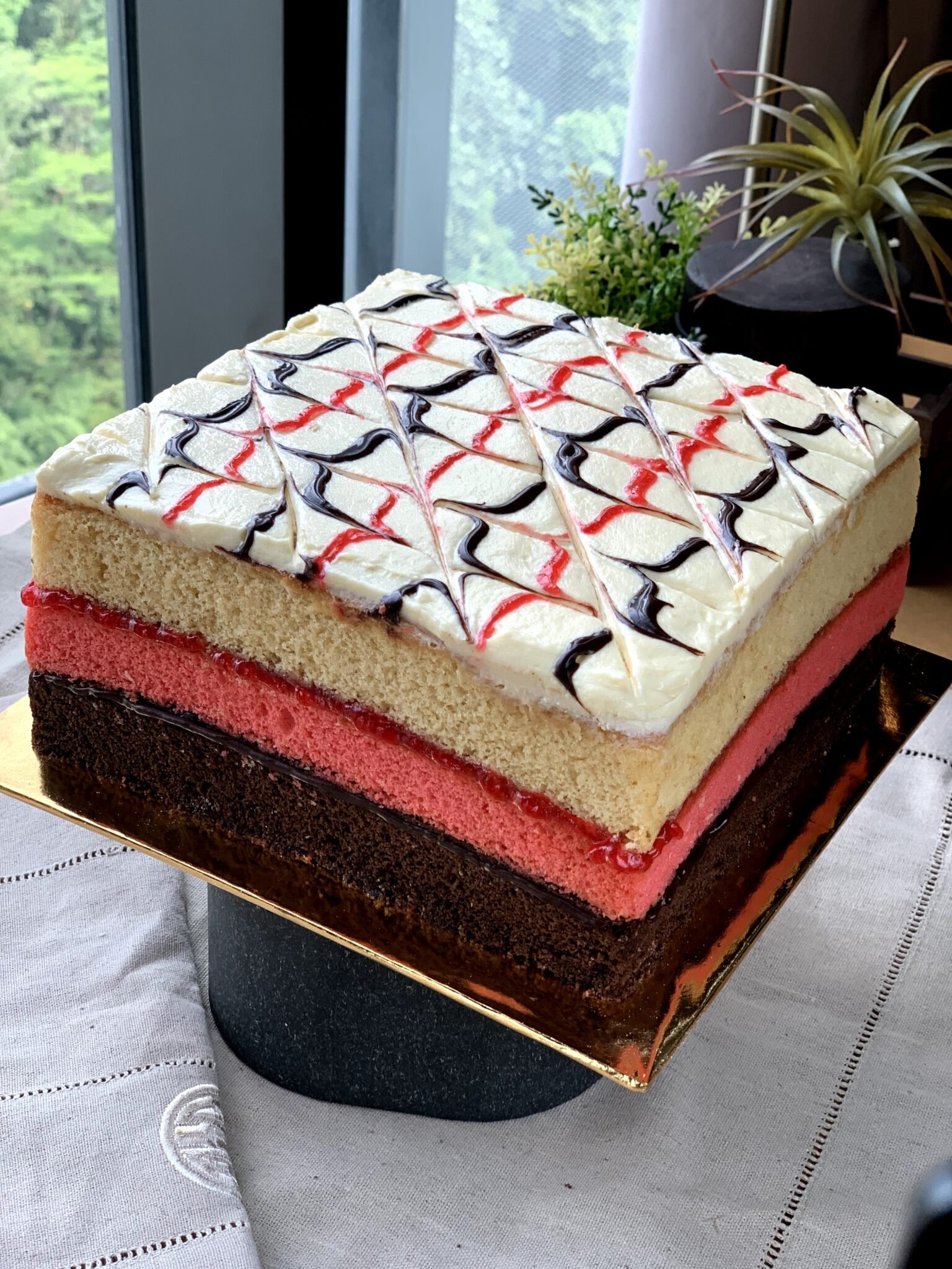 " Cntknya presentation from u.. packaging was neat as always. The cake was super tasty n perfect.. less sweet which i love the most. My 2nd slice 😂 ; sedap sangat with 3 flavours of neapoliton yg i love always. Macam banana split n flavourful 🤩. Its smell so good. Puas makan with this kinda size, sgt berbaloi, if outside mmg mahal for sure. "