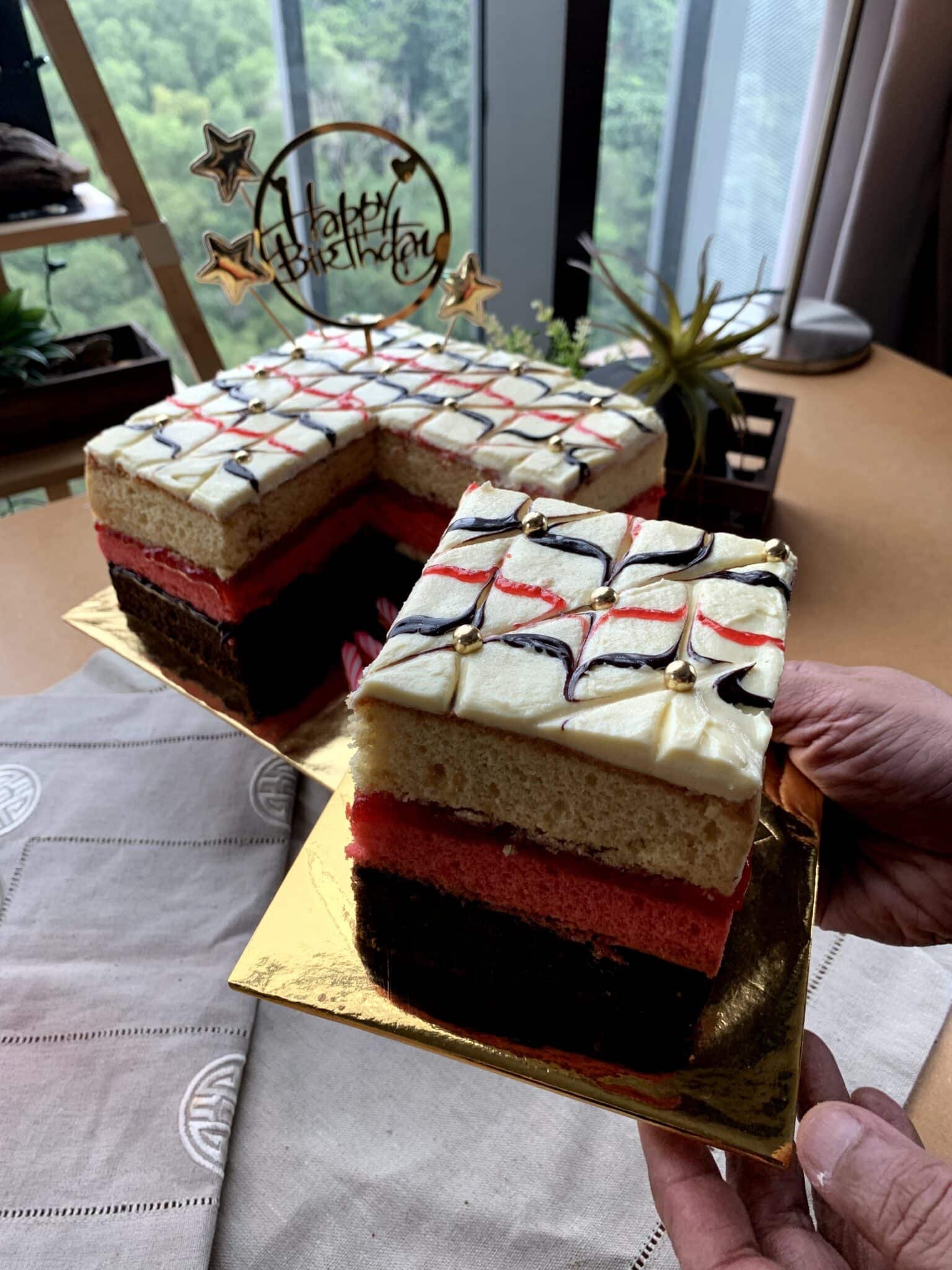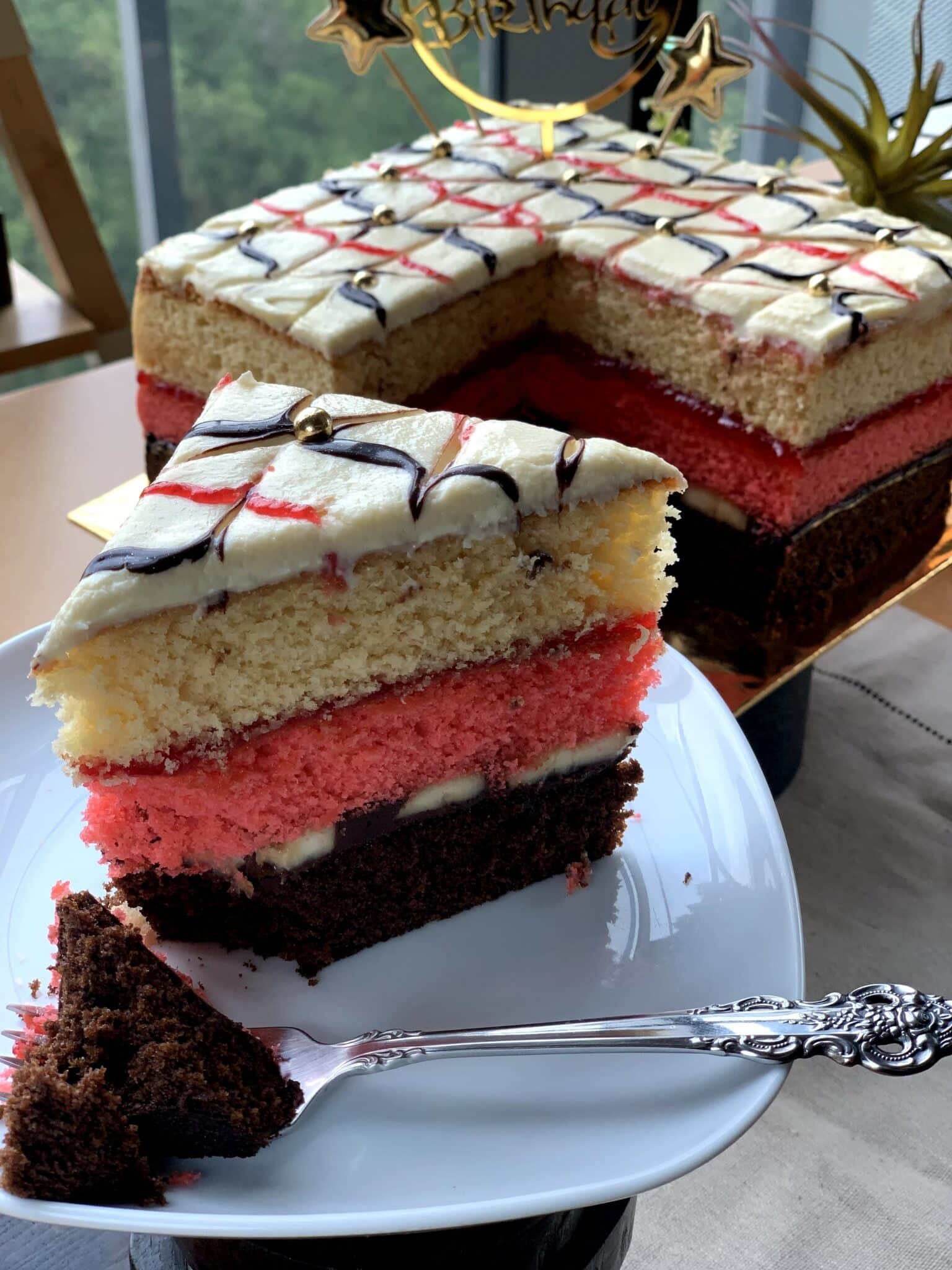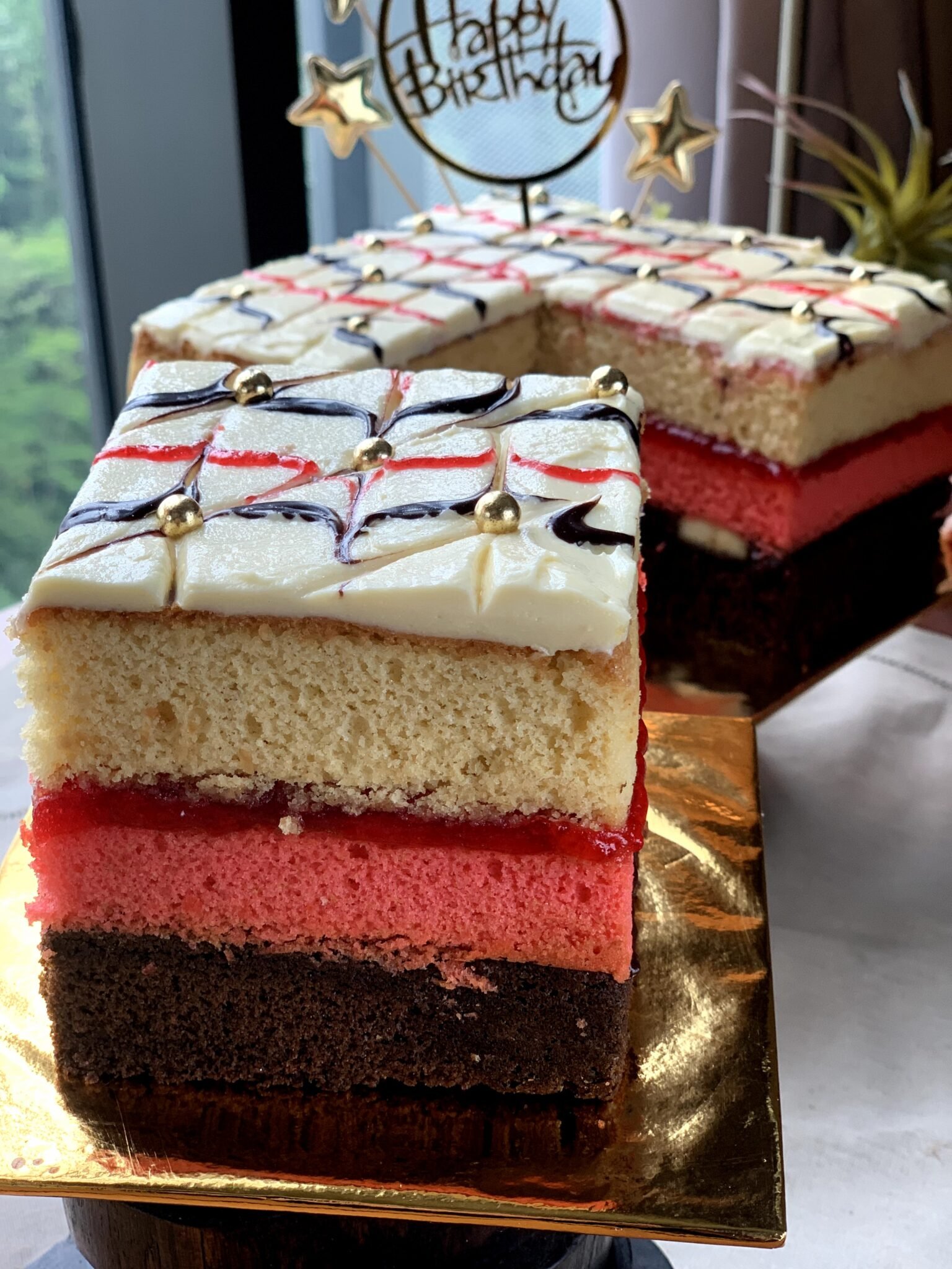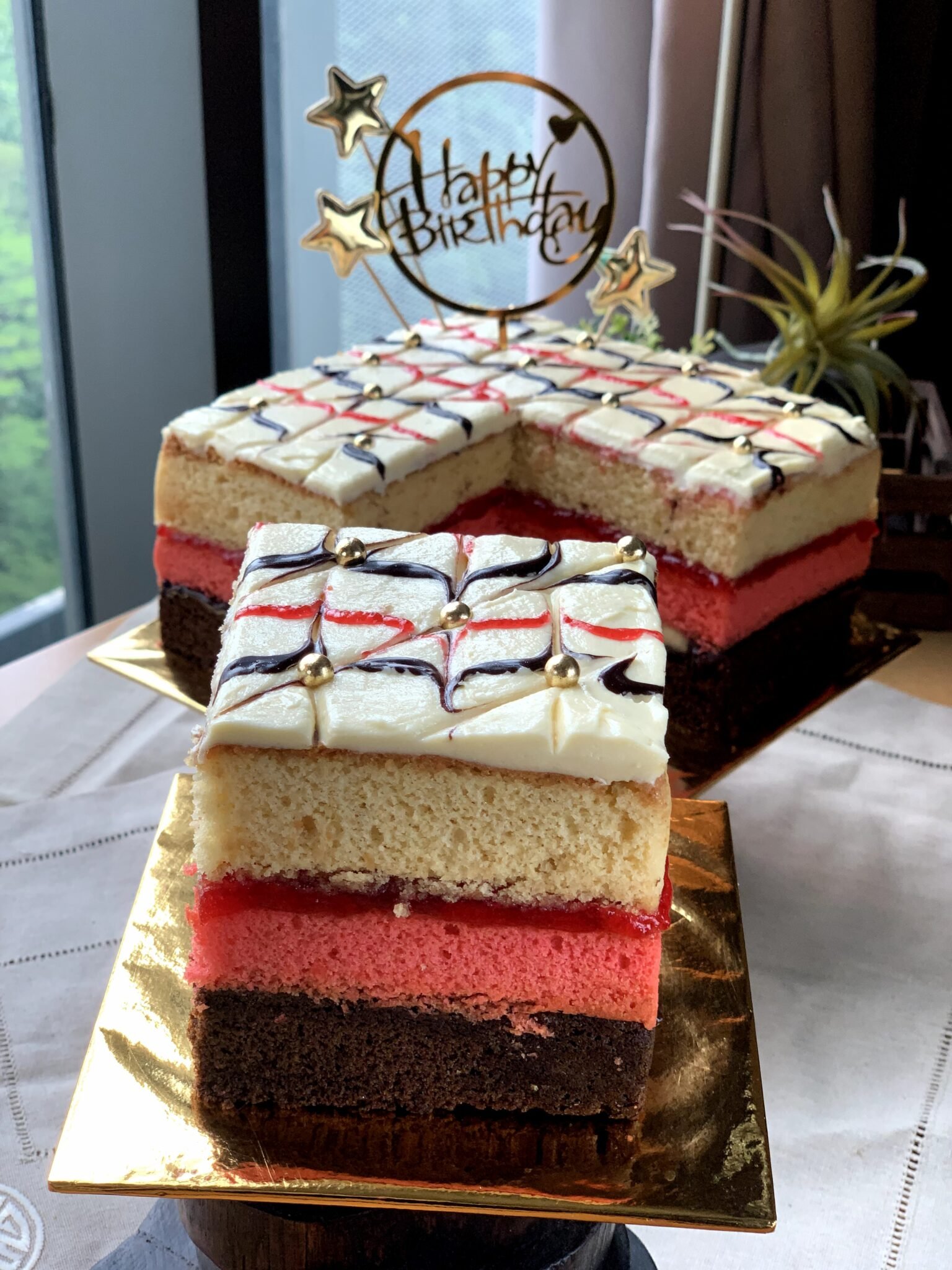 " Cntknya presentation from u.. packaging was neat as always. The cake was super tasty n perfect.. less sweet which i love the most. My 2nd slice 😂 ; sedap sangat with 3 flavours of neapoliton yg i love always. Macam banana split n flavourful 🤩. Its smell so good. Puas makan with this kinda size, sgt berbaloi, if outside mmg mahal for sure. "