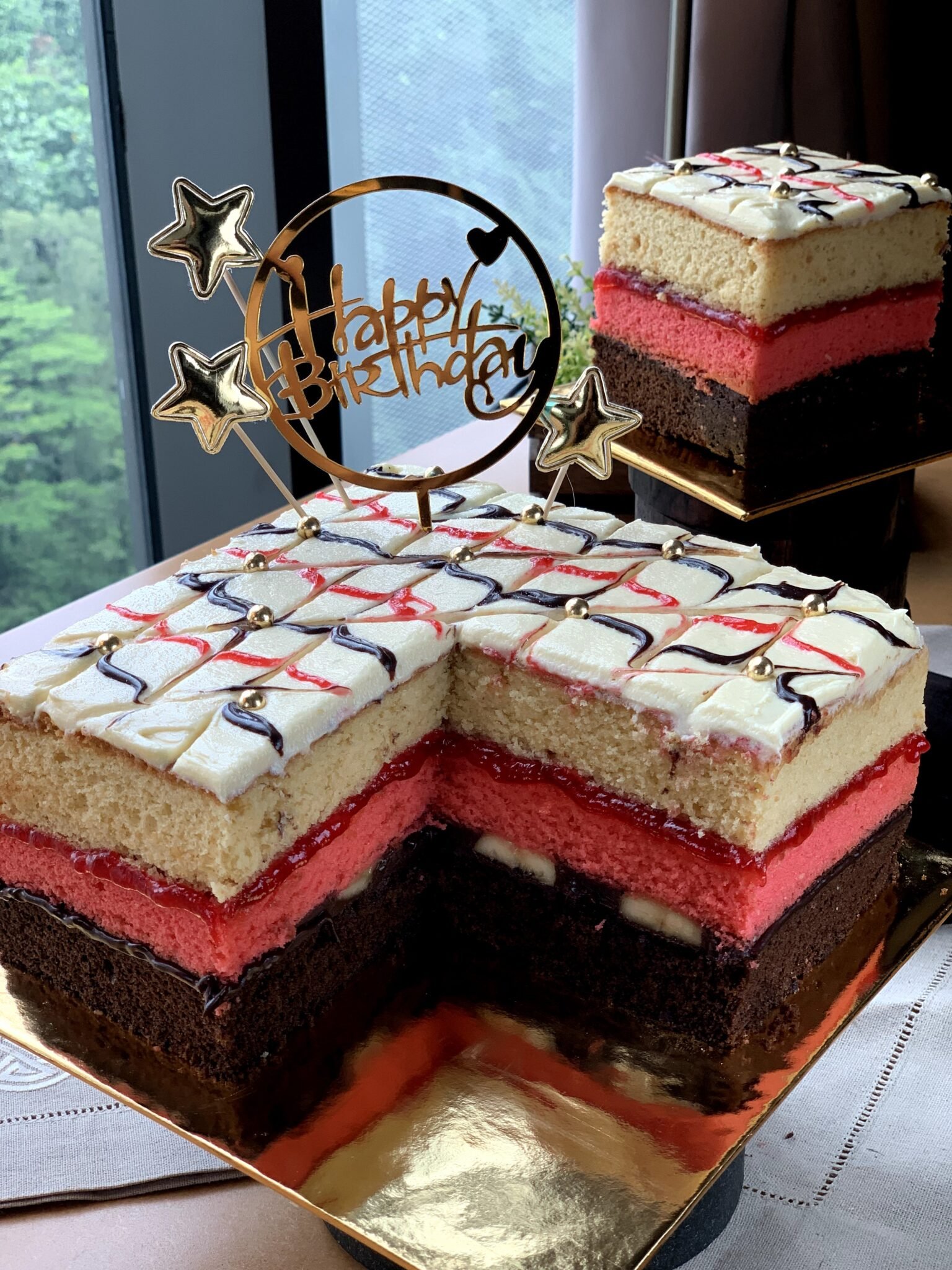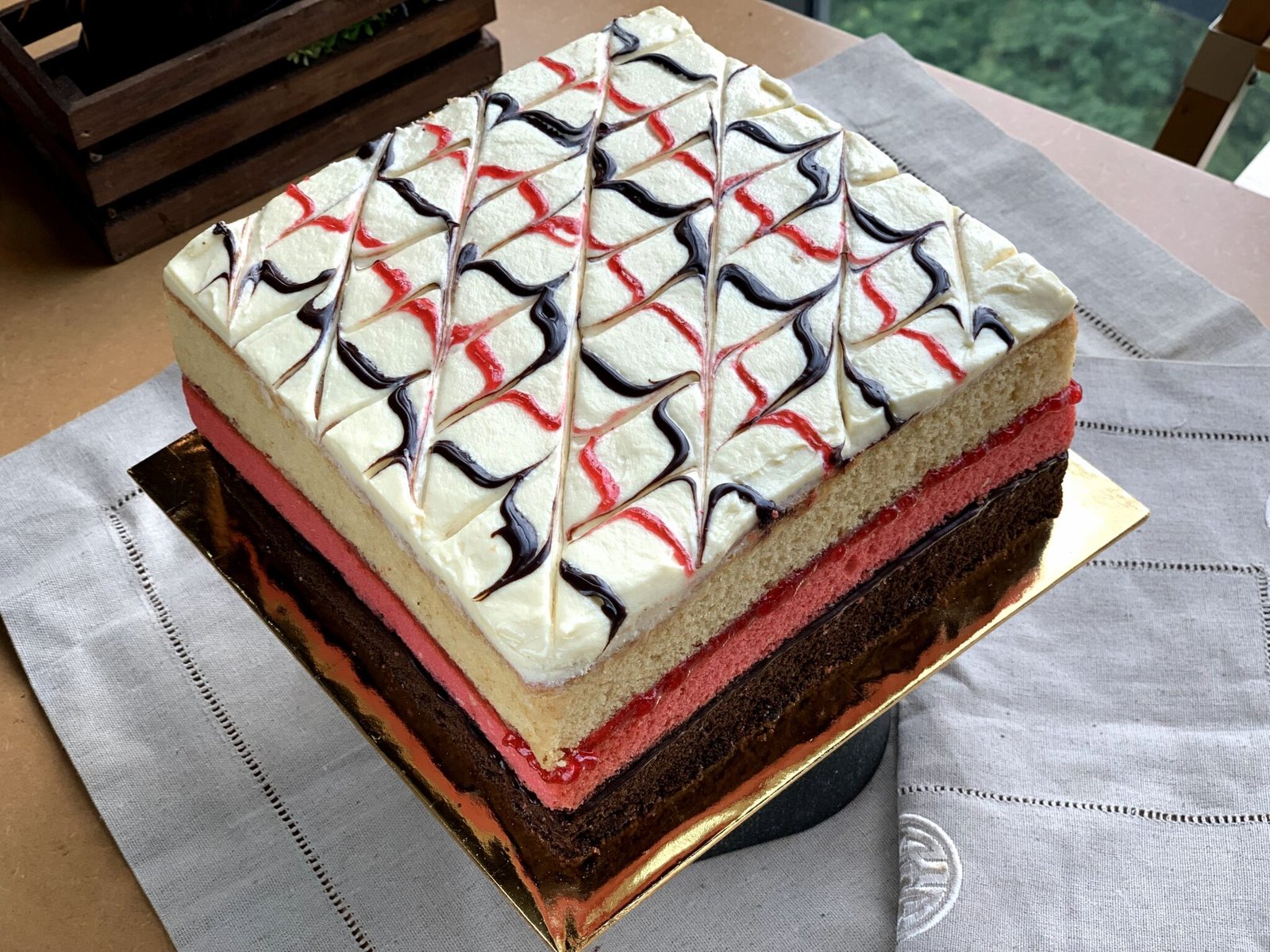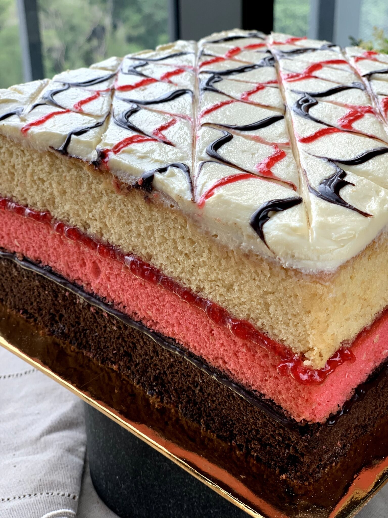 Three square layers of chocolate, strawberry, and vanilla goodness, inspired by the classic ice cream. Add in dark chocolate ganache, bananas, salted caramel, and zesty strawberry compote, all topped with cream cheese buttercream | 8" Square Pan, 4" tall, Serves 16-24 ( 1.8kg )