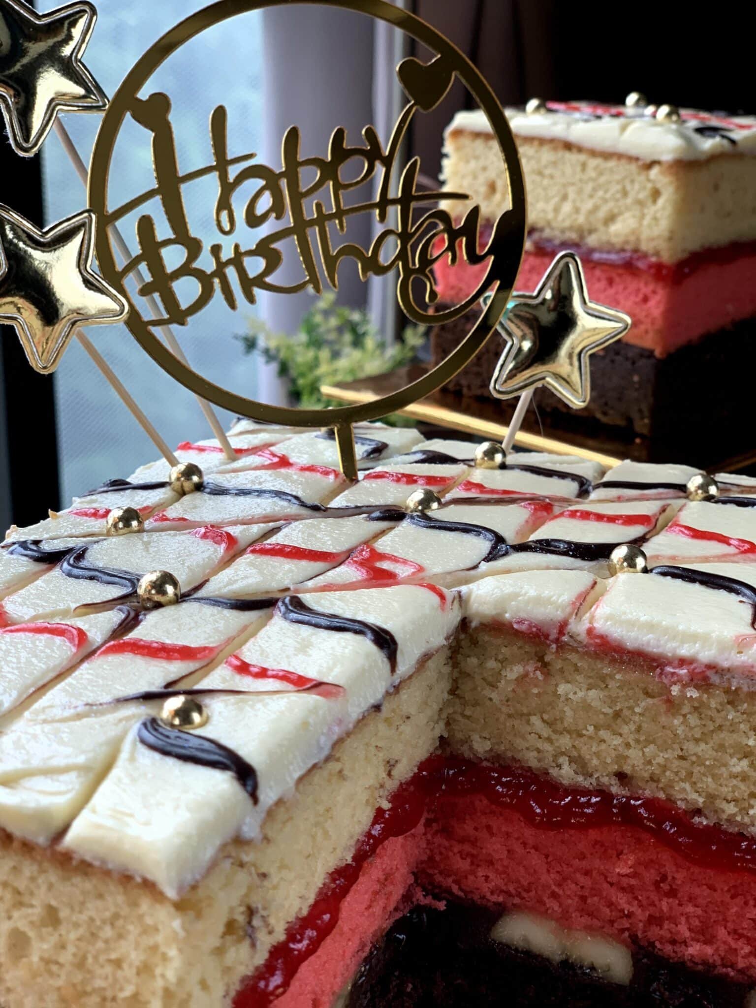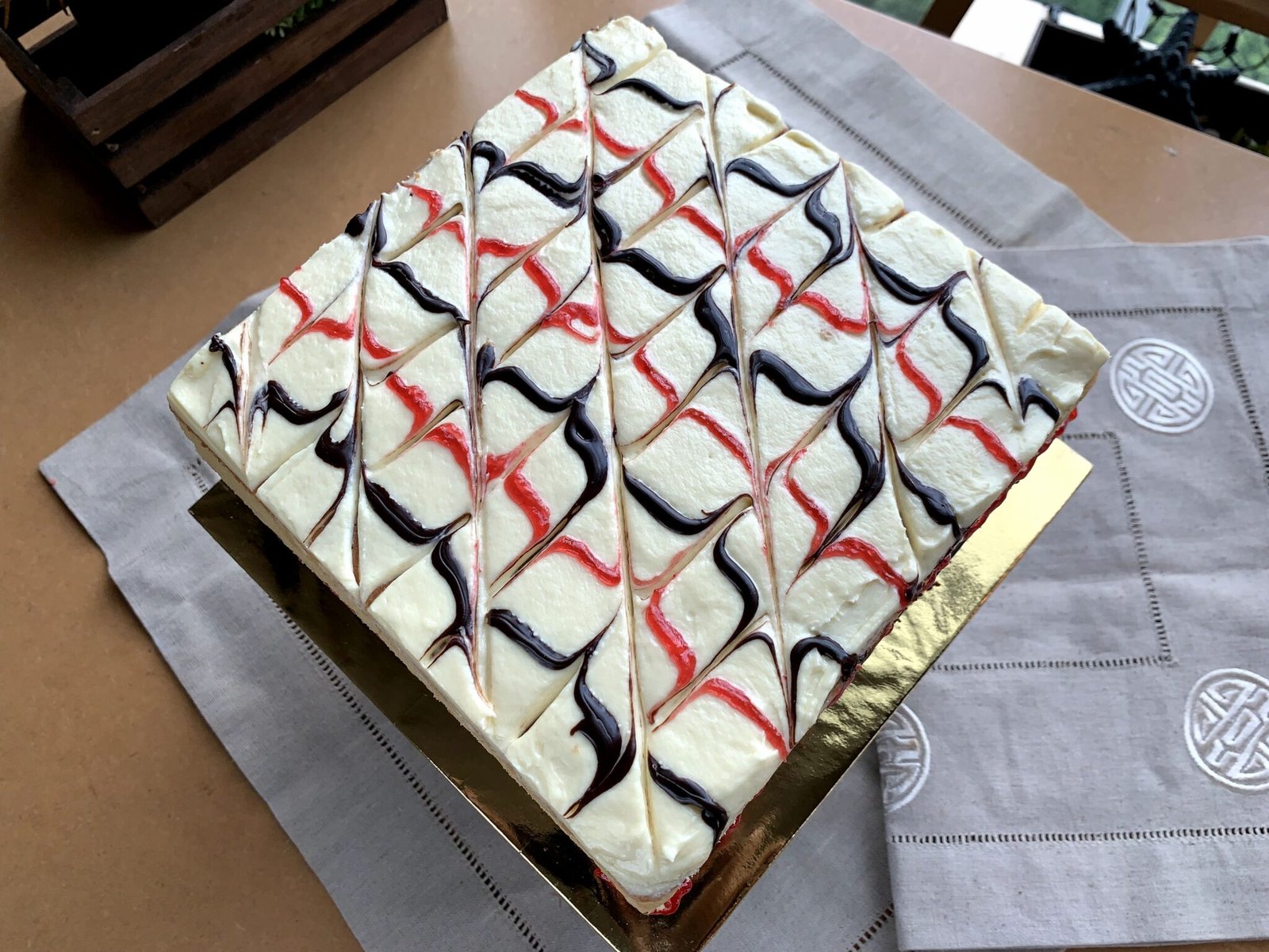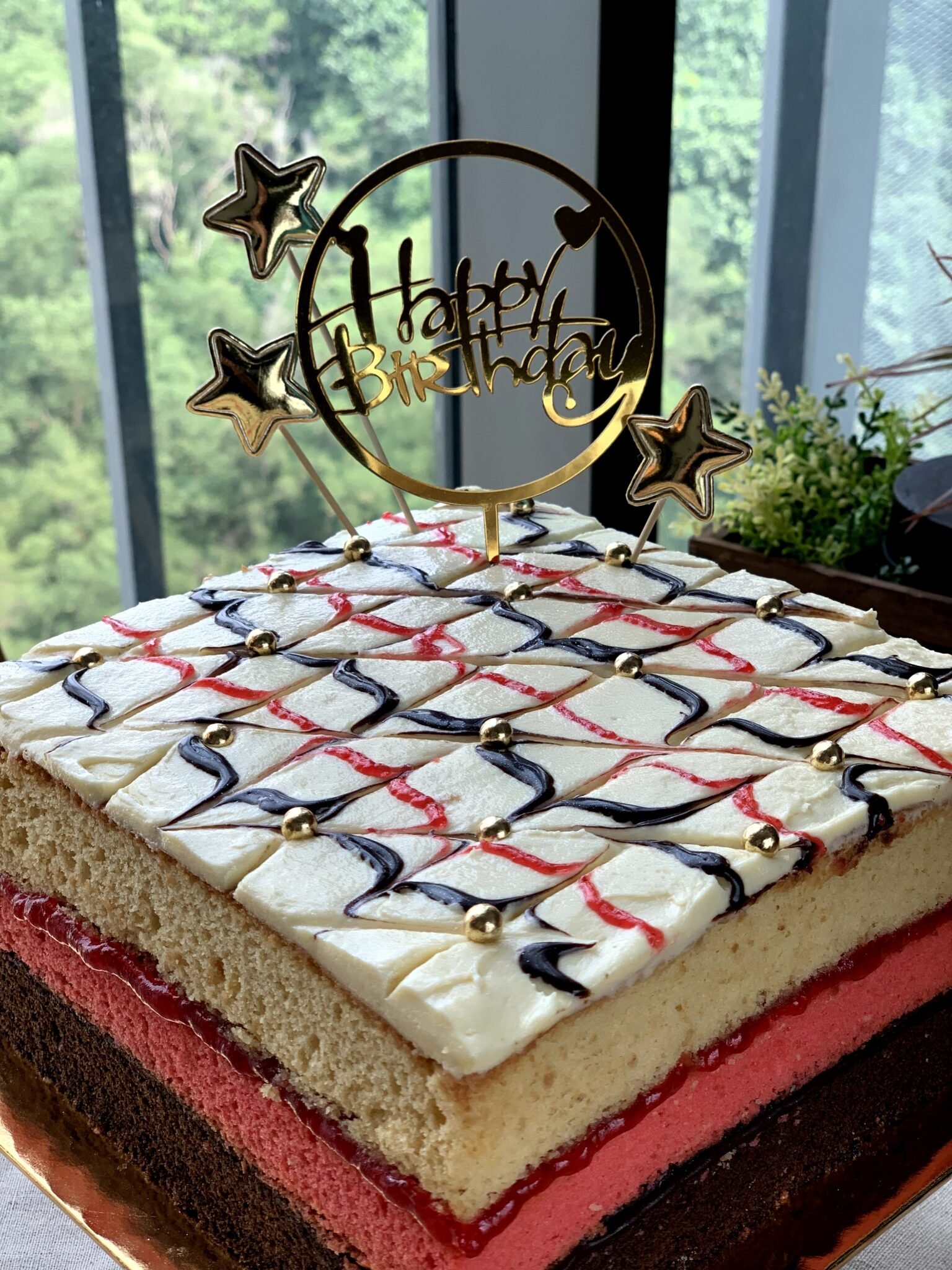 Three square layers of chocolate, strawberry, and vanilla goodness, inspired by the classic ice cream. Add in dark chocolate ganache, bananas, salted caramel, and zesty strawberry compote, all topped with cream cheese buttercream | 8" Square Pan, 4" tall, Serves 16-24 ( 1.8kg )