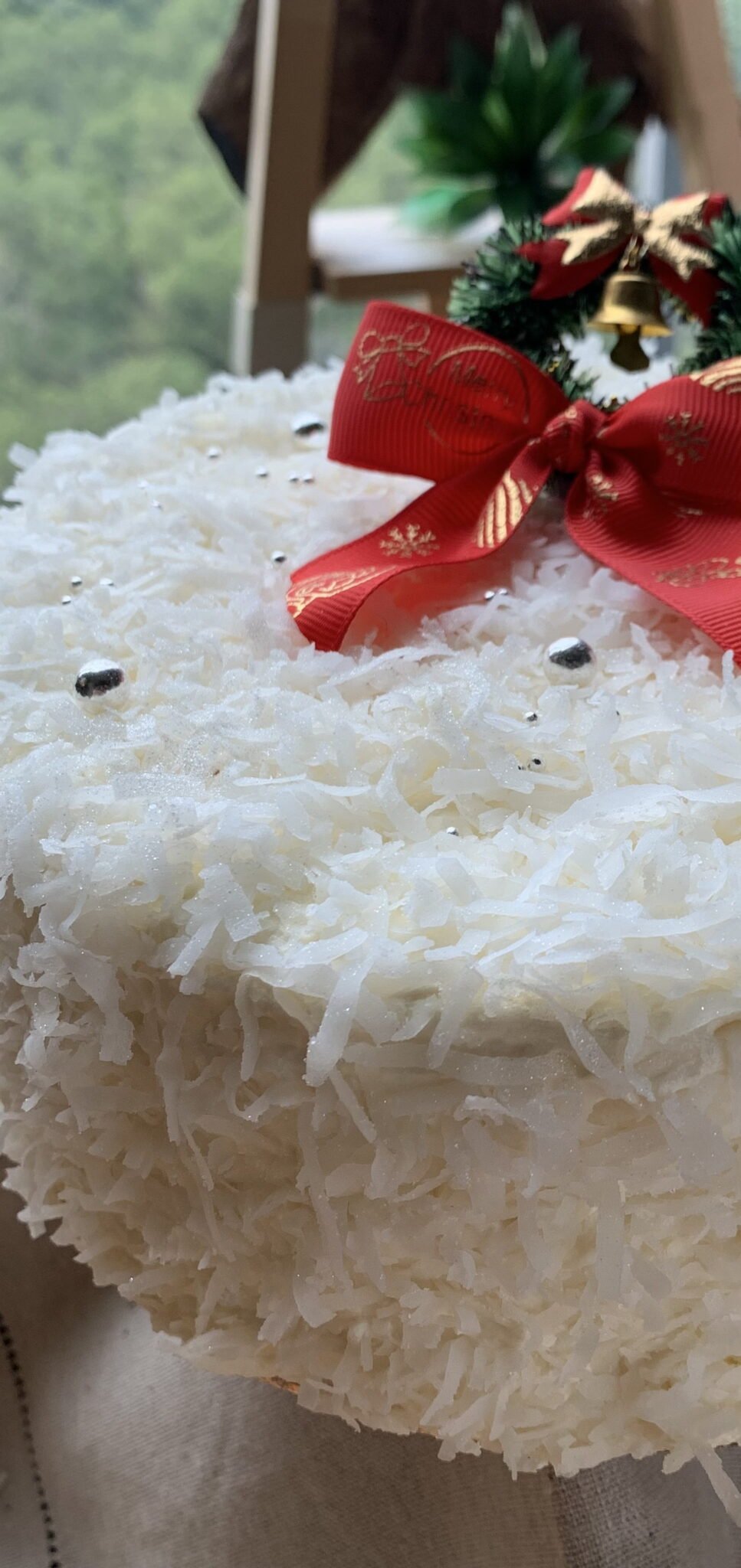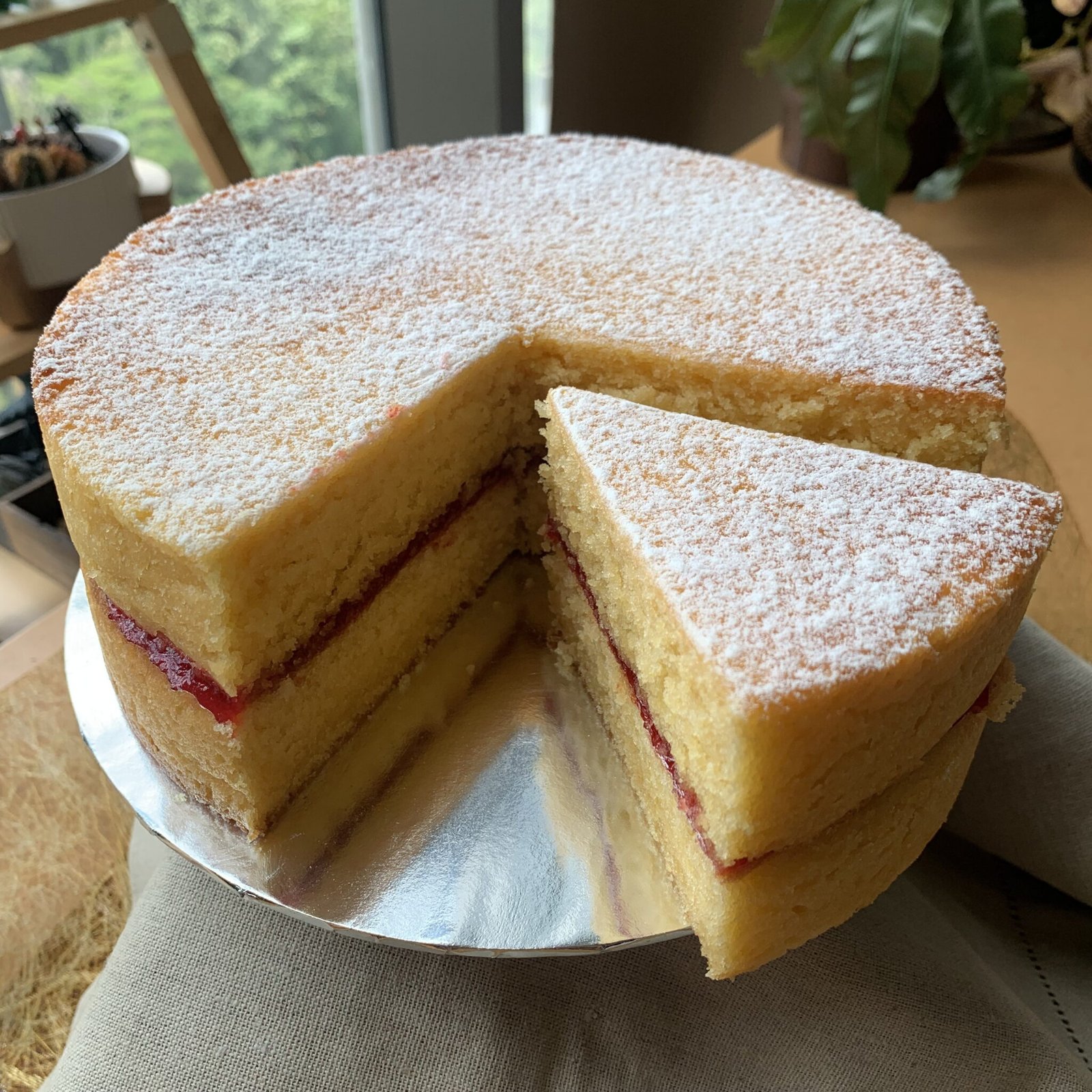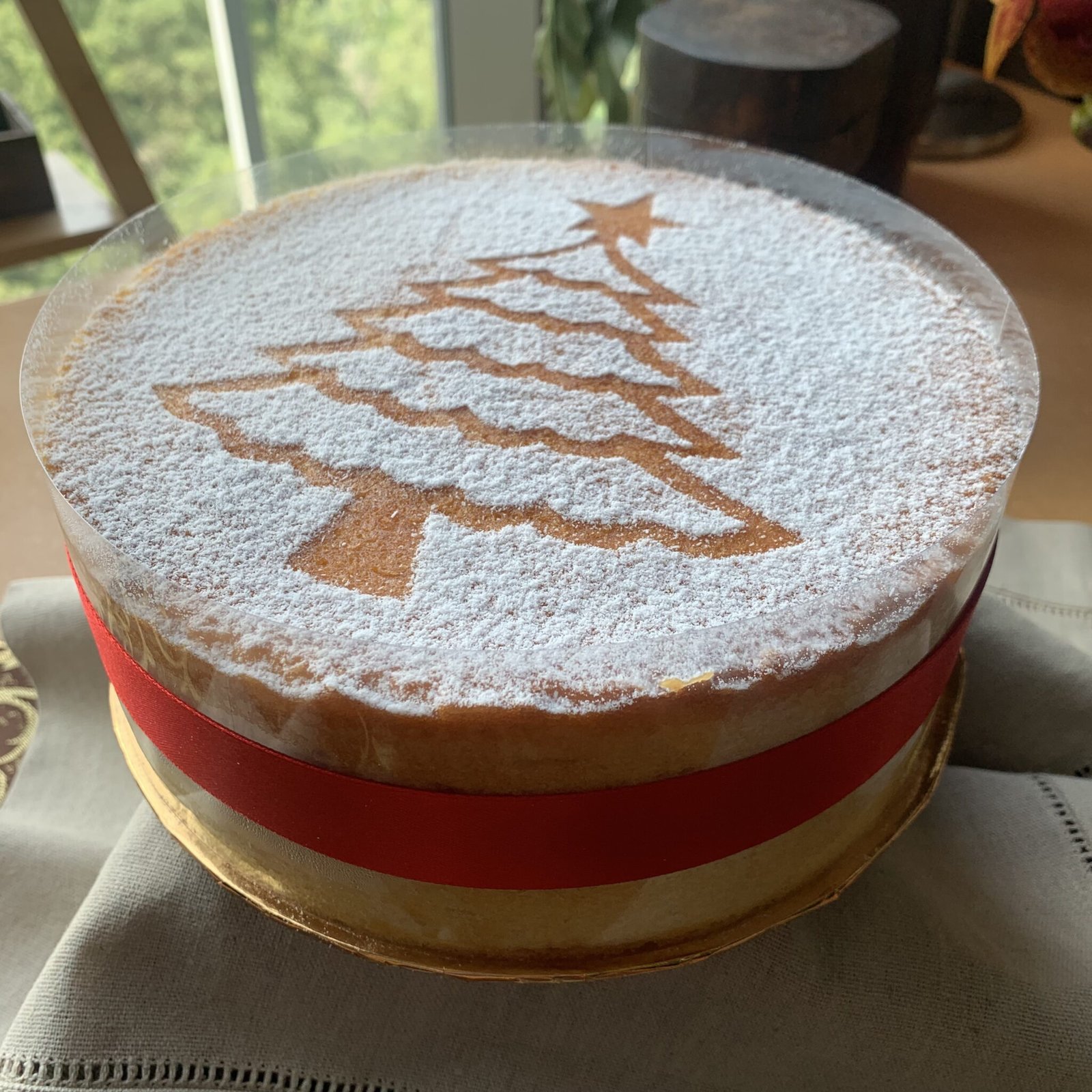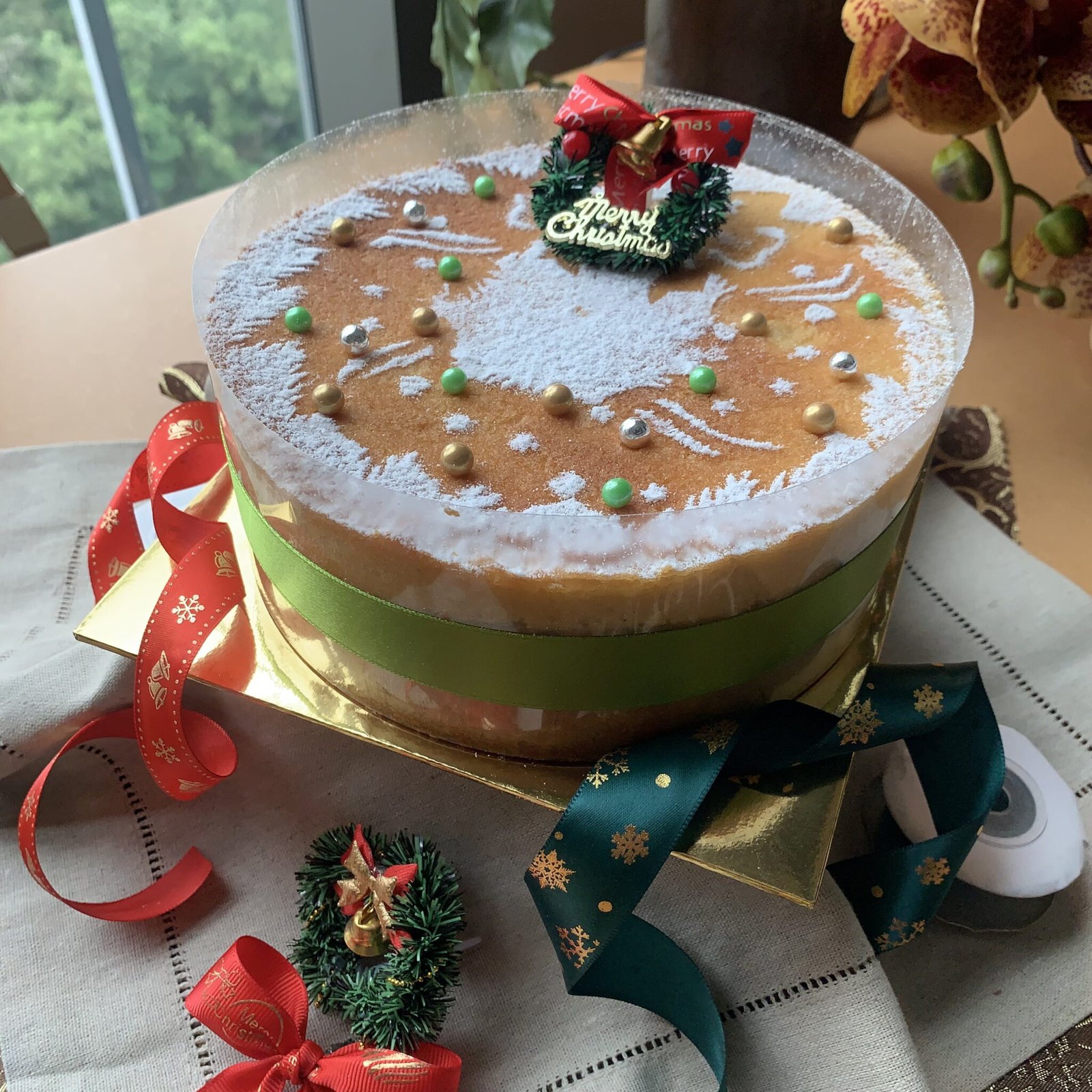 Soft sponge layered with strawberry jam, finished with decorative snow-powder Christmas elements.